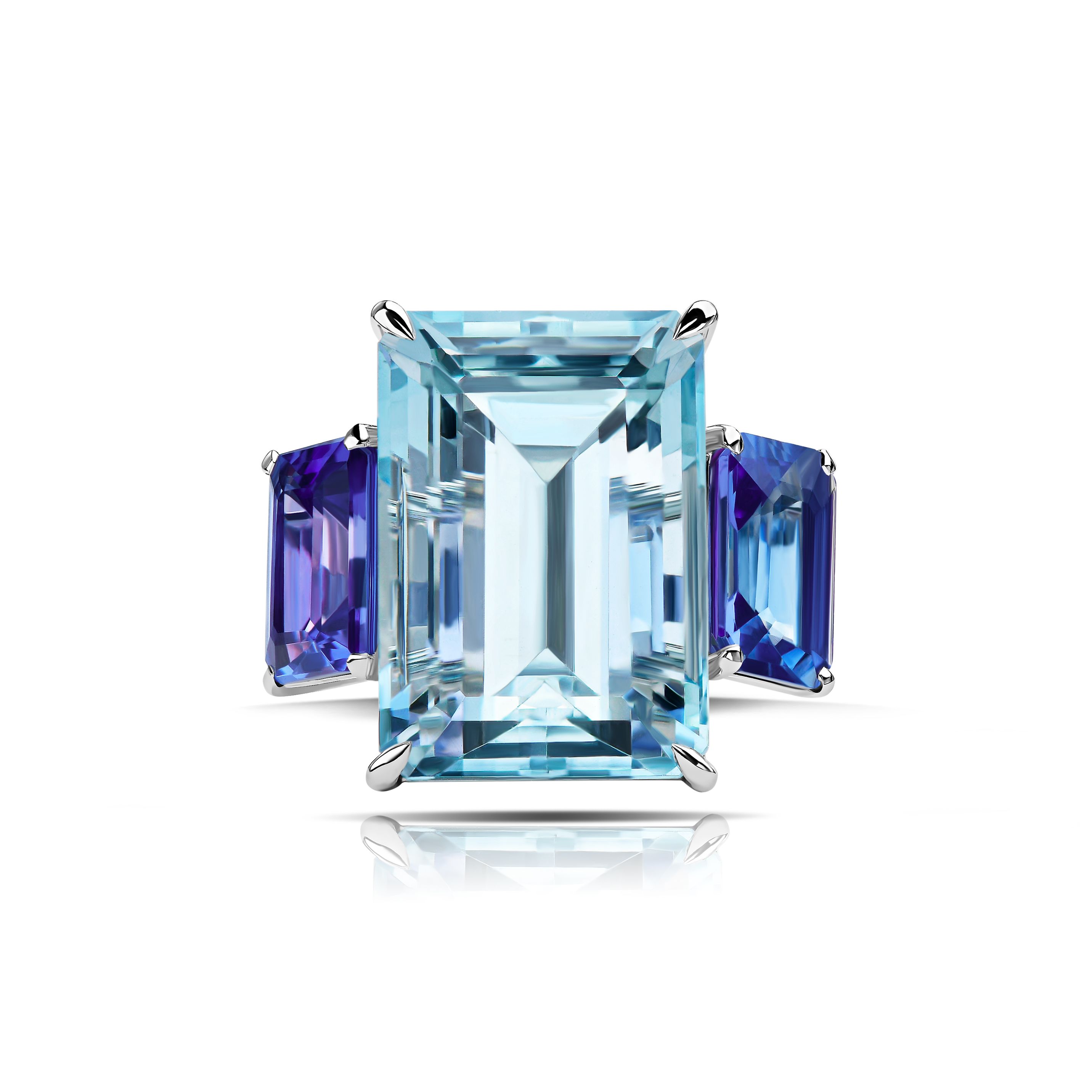 10.06 ct octagon-cut aquamarine ring, flanked by 2.62 ct of exquisite octagon-cut tanzanite, each stone a serene shade of blue that speaks to the soul's longing for the ocean's tranquility. By Jewelry Design Studio Parure Atelier is set in 18k white gold, a metal that enhances the aquamarine's cool luster with understated elegance. The central stone is complemented by the vibrant tanzanites, making this ring a rare find for those with a discerning eye for unique gemstones.