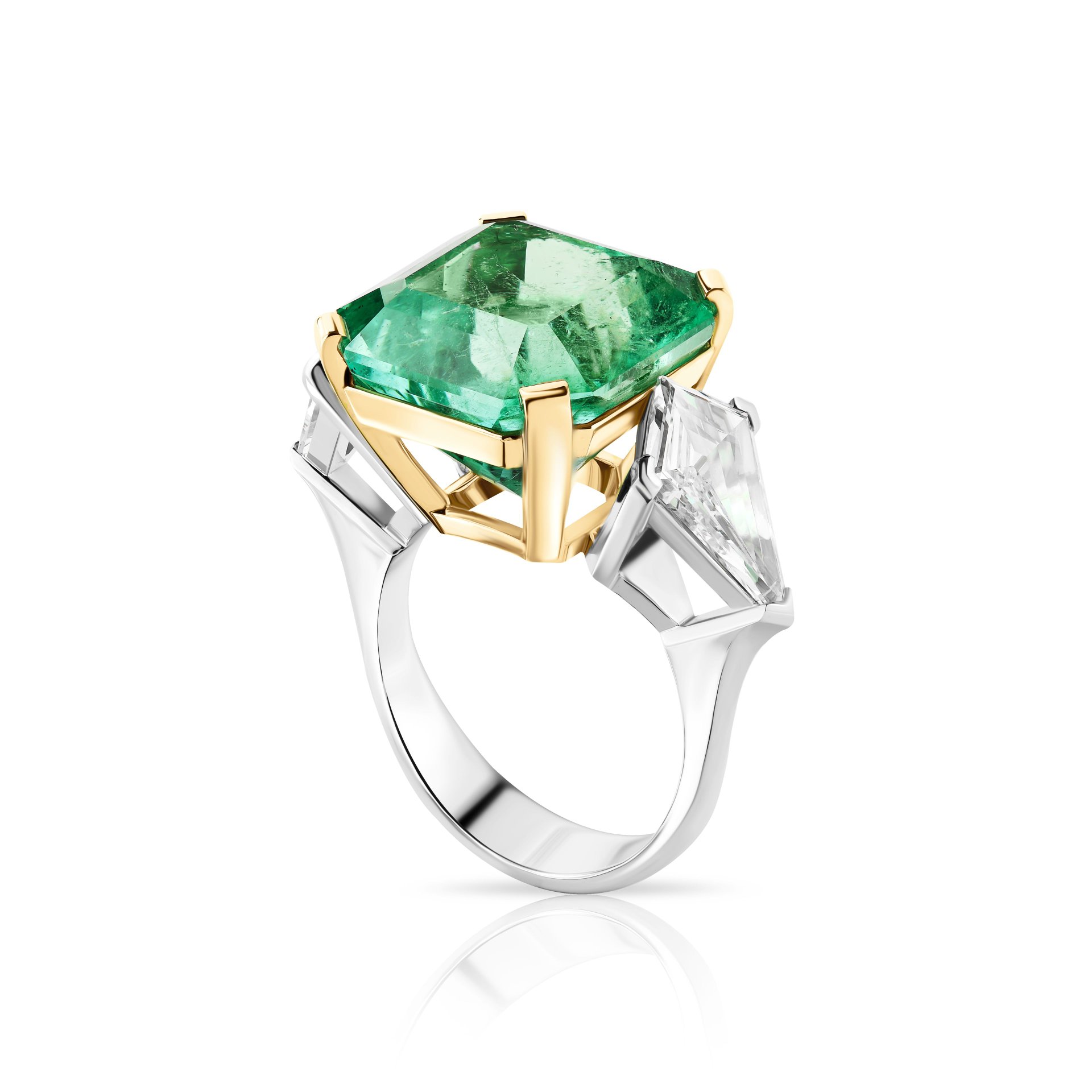Introducing the 14.02 ct Emerald Ring from Jewelry design studio Parure Atelier that blends harmony with a touch of the extraordinary. Central to this piece is 14.02 carat Colombian emerald, boasting a vibrant green that captures the lush landscapes of its origin. Its octagonal cut not only accentuates the stone's geometric perfection but also its deep, rich color. Crafted with a blend of yellow and white 18k gold, offers a luxurious contrast that highlights the emerald's vividness. Complementing the central gem are two side stones, kite-shaped diamonds totaling 1.02 carats, chosen for their unique shape. Weighing 11.10 grams, this piece is a testament to the balance of precise proportions. It is designed for those with a penchant for significant, bold jewelry that doesn't shy away from making a statement of luxury and elegance.
