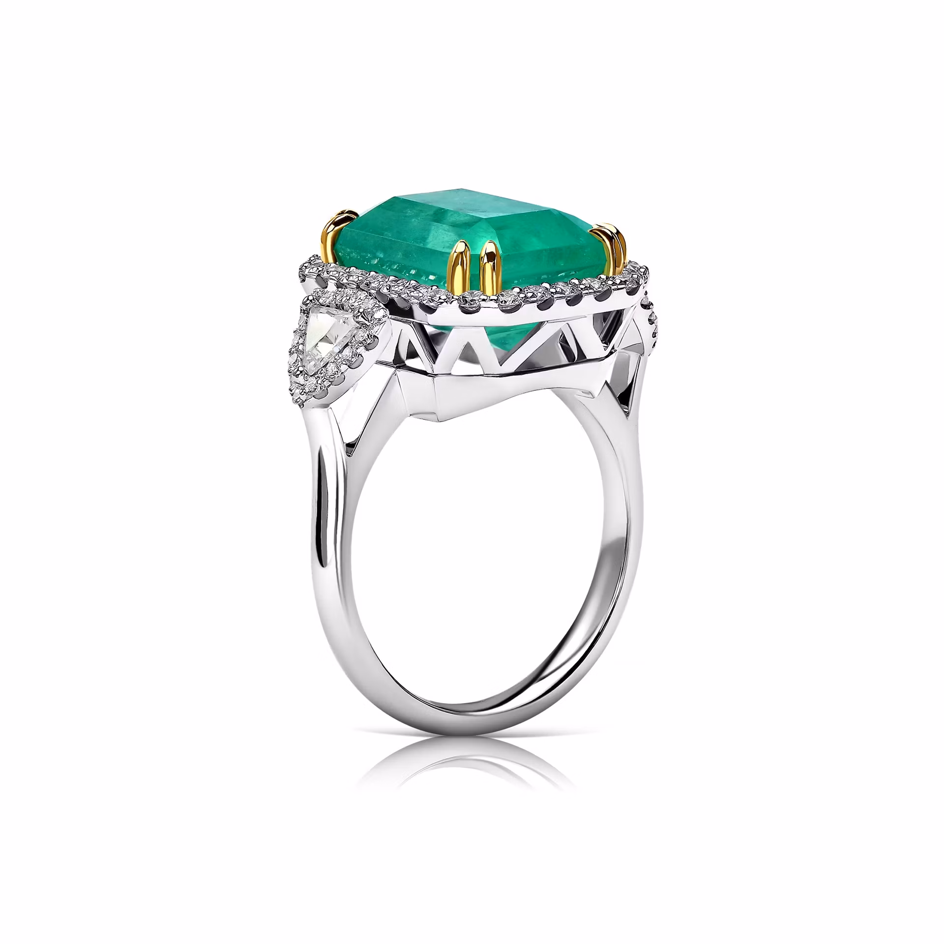 Presenting the exquisite 6.99 ct Emerald Ring from Jewelry design studio Parure Atelier. At its core sits a Colombian emerald of 6.99 carats, its vibrant green hue as lush as the rainforests from which it hails, shaped into a classic octagon for a display of sheer magnificence. The emerald's arresting beauty is complemented by the cool, sheen of 18k white gold, and the design is further accentuated by 0.28 carats of trillion-cut diamonds. These side stones add a modern twist to the ring with their sharp angles and clear brilliance. This ring weighs a significant 7.89 grams, signifying a substantial presence on the hand that is both felt and seen. Each element of this piece has been thoughtfully selected and expertly fashioned to create a harmonious balance.