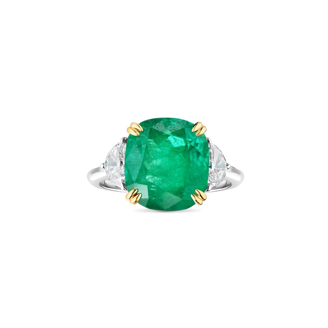 The ring is further adorned with two halfmoon-shaped diamonds on either side, totaling 0.54 carats, with a D color and VS clarity. These diamonds complement the emerald's radiance, adding to the ring's overall luminance. Crafted with the utmost precision, this ring is an exquisite selection for those who appreciate the fine details and majestic allure of rare gemstones.