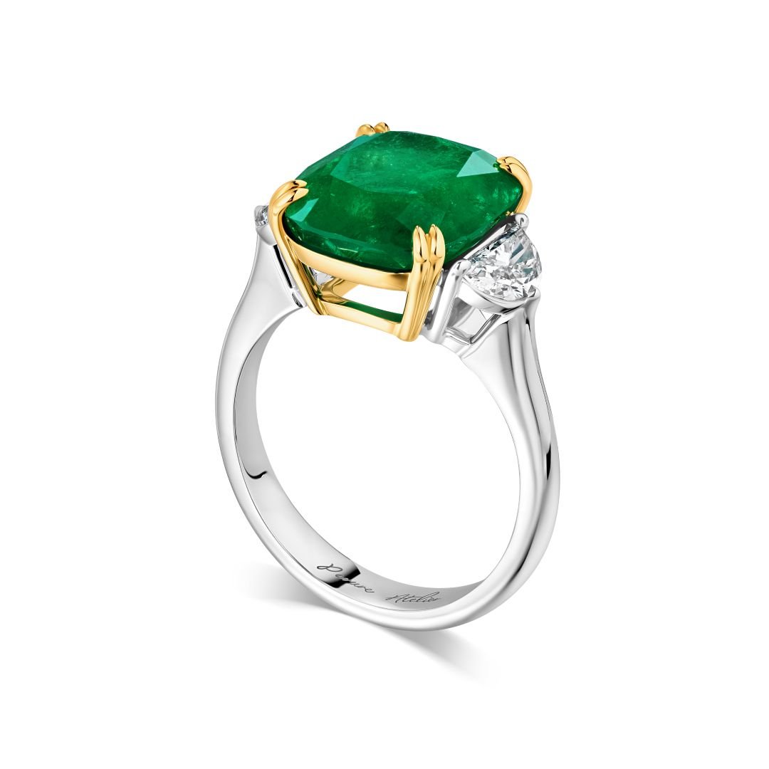 Presenting the 5.30 ct Emerald Ring, a prized jewel in the Parure Atelier collection, featuring a central stone of Colombian origin known for its vibrant and intense green color. The emerald, cut in a classic cushion shape, weighs an impressive 5.30 carats, making it a centerpiece of undeniable prestige. This gem is set in a sleek 18k white gold band, accentuating its vivid hue with a subtle sheen.