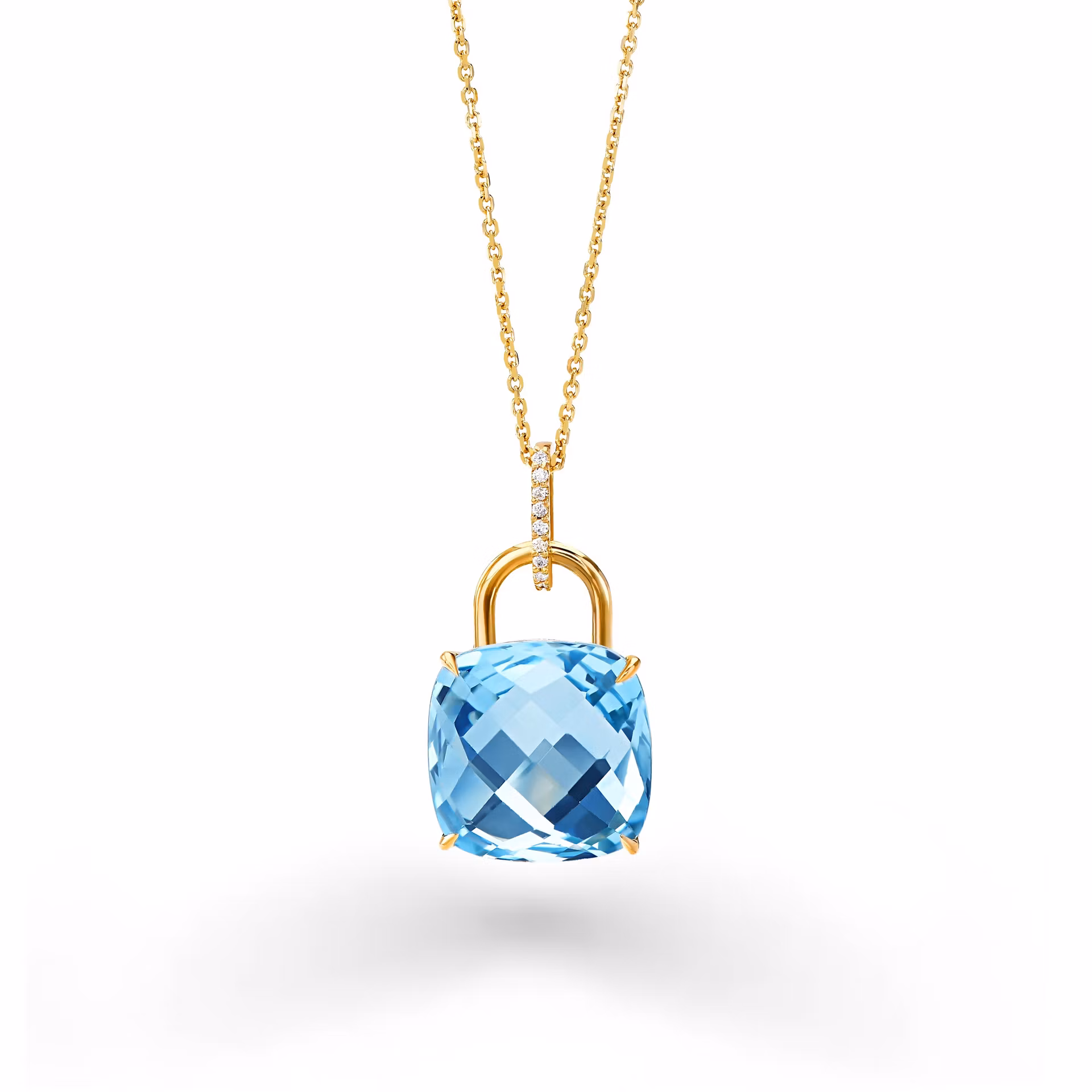 The Topaz Pendant from Jewelry Design Studio Parure Atelier is a celebration of timeless elegance and a gift to be cherished for eternity. At its center, a cushion-cut topaz glows with the serene blue of a tranquil sea, set in the warm luster of 18k yellow gold. Diamonds add whispers of light along the pendant's bail, creating a striking contrast against the yellow gold. Weighing in at 8.76 grams, this pendant is a substantial piece that promises both grandeur and grace. It is a token of affection that speaks to the heart, an enduring piece that complements the natural beauty of the one who wears it. With this pendant, Parure Atelier continues its tradition of crafting jewelry that’s not only seen but also felt.