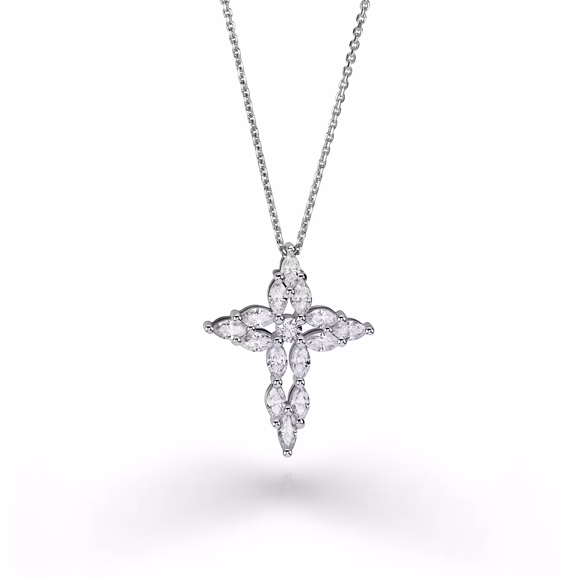 Parure Atelier brings to you a symbol of faith and finesse with the 0.84 carat Diamond Cross Pendant. Skillfully set within this divine piece are marquise-cut diamonds, harmoniously arranged to form the revered cross, each reflecting a celestial light. The central stones, of impeccable 3/5 quality, come together for a total weight of 0.84 carats, with round diamond at 0.027 carats enhancing the pendant's heavenly glow. Cast in the purity of 750-grade white gold, this pendant is not just an accessory, but a testament to the wearer's cherished beliefs. It embodies Parure Atelier commitment to creating jewelry that serves as a beacon of hope and luxury.