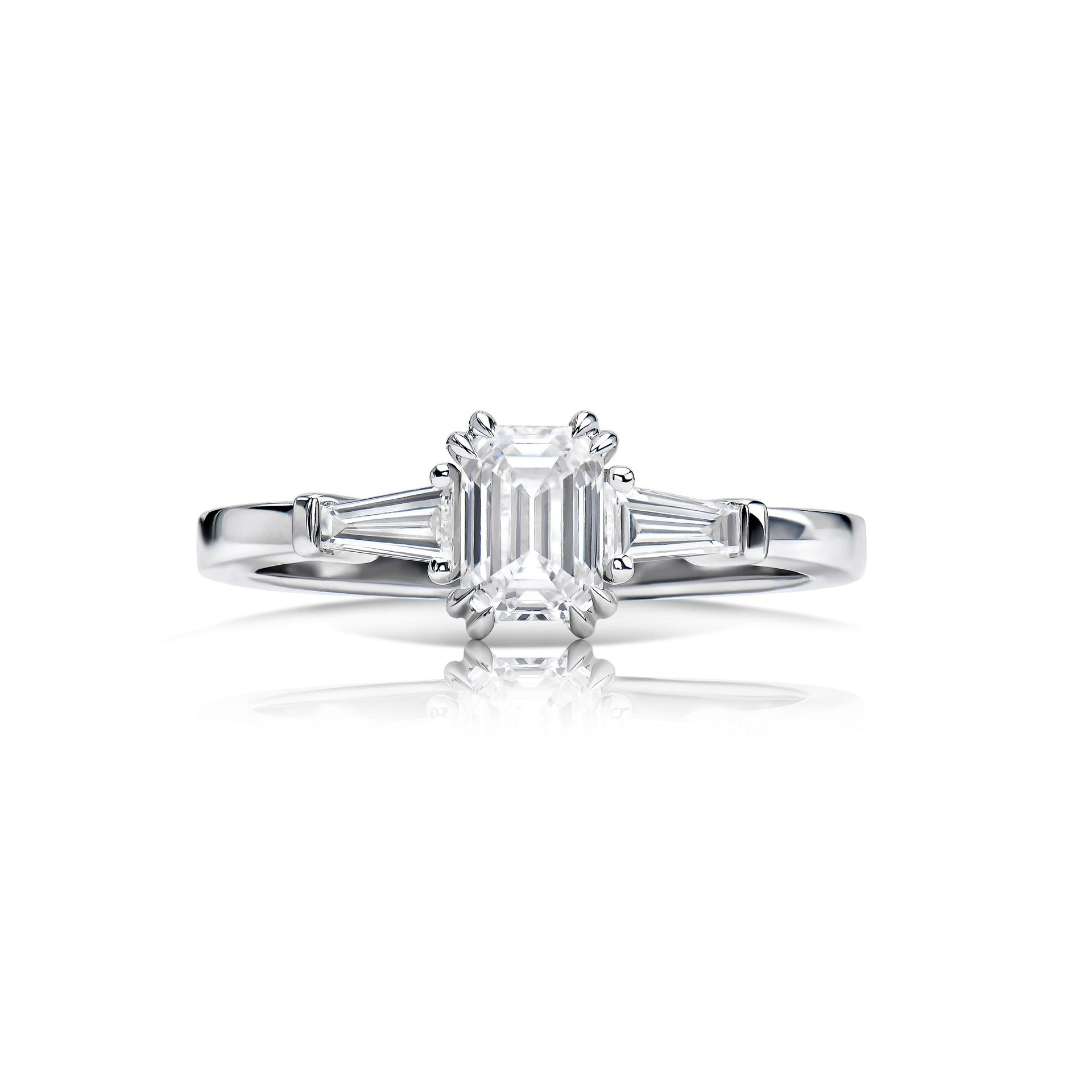This 1 ct emerald cut diamond ring is a paragon of timeless elegance, presented by Jewelry Design Studio Parure Atelier. The central diamond, rated E/VVS for its exceptional clarity and colorless quality, radiates with a sophisticated step-cut. The 18k white gold band complements the cool brilliance of the diamond, enhancing its natural luster. Beside the central emerald cut diamond, tapered baguette side stones add a contemporary edge to the classic design, their linear shape harmonizing with the central stone’s geometry. This ring, with a total side stone weight of 0.15 ct, is a testament to the luxury and precision that our Dubai clientele cherish.