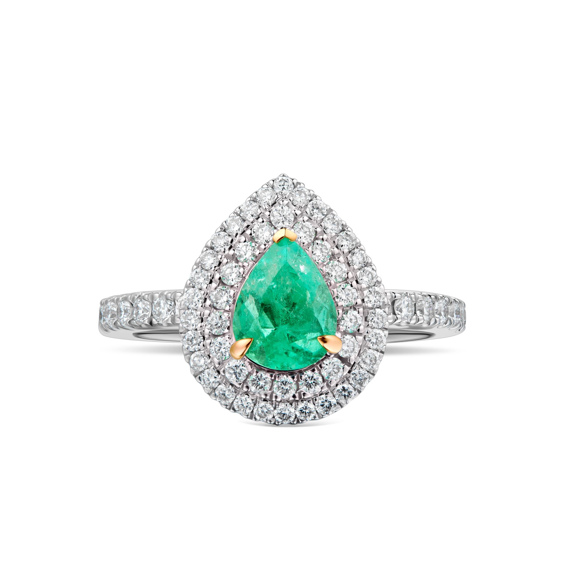 Discover the timeless elegance of our Emerald Ring, a signature creation by Jewelry Design Studio Parure Atelier. At the heart of this exquisite piece lies a 0.88 ct pear-shaped emerald, radiating a verdant hue that captures the essence of nature's beauty. This central gemstone is cradled in a setting of 18k white gold, chosen for its purity and resilience. The emerald is flanked by a constellation of round brilliant side stones, totaling 0.59 ct, which encircle the main stone in a radiant halo and cascade down the band, providing a sparkling contrast to the vivid green centerpiece. Each diamond is a testament to our commitment to quality and craftsmanship. This ring is an embodiment of classic design with a modern sensibility, perfect for those who appreciate fine jewelry with a story. It is a piece that doesn't just adorn but enchants, capturing the imagination with its subtle sophistication and style.