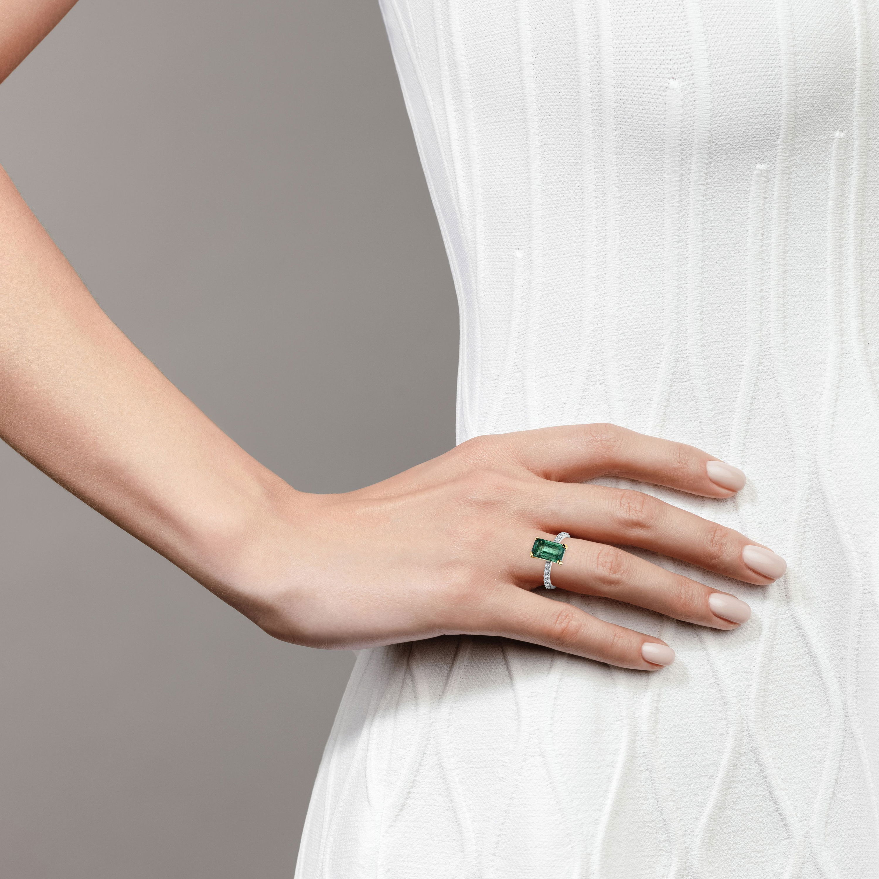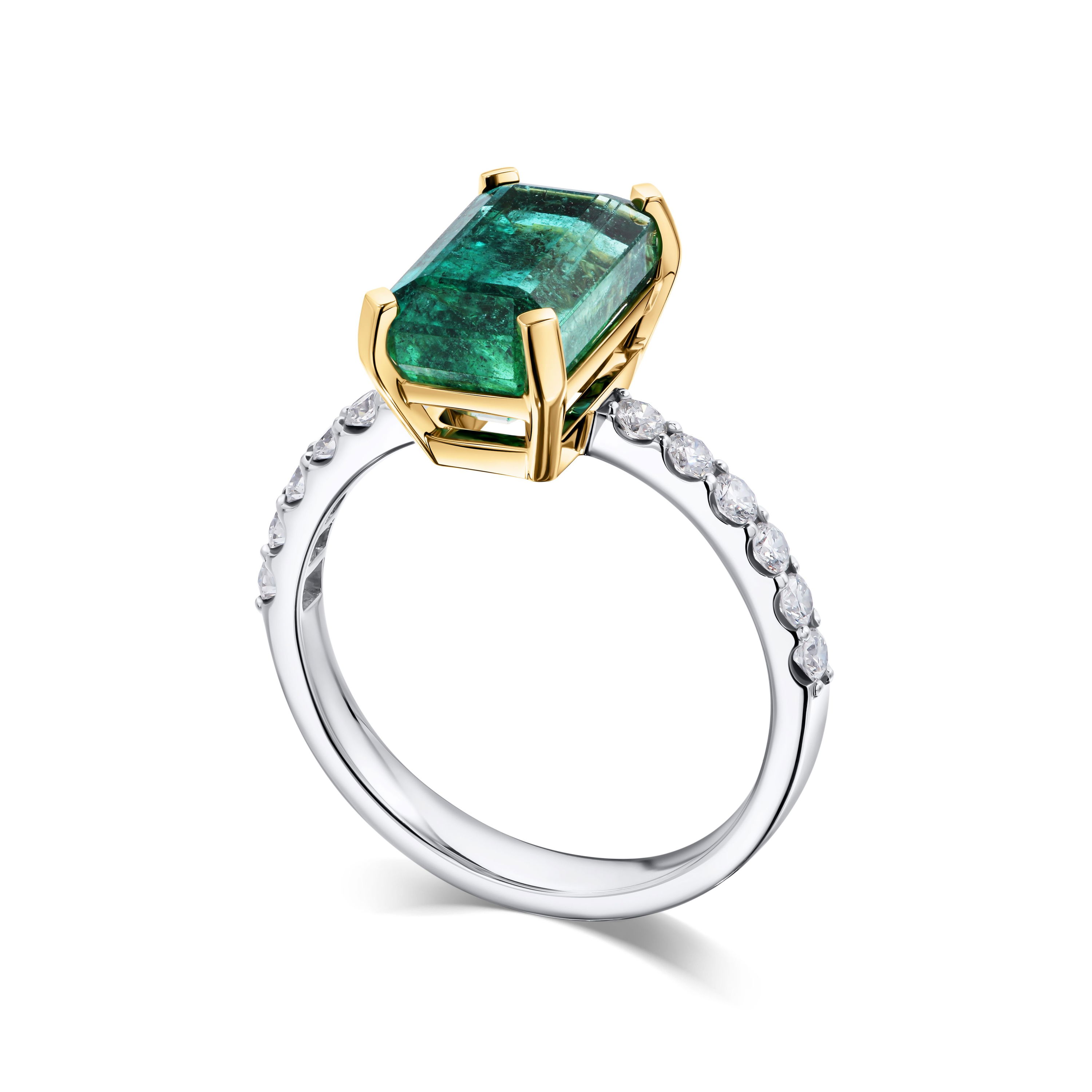 Кольцо с изумрудом 1.90 карат привлекает внимание своей четкой геометрией и насыщенным зеленым оттенком центрального камня. Изумруд весом 1.9 карата аккуратно закреплен на тонком белом золоте, что подчеркивает его естественную красоту и глубину цвета. По обеим сторонам основного камня расположены небольшие бриллианты, которые добавляют изделию дополнительную игру света и изящную детализацию. Лаконичный дизайн позволяет кольцу гармонично сочетаться с разными стилями, оставаясь при этом заметным акцентом.