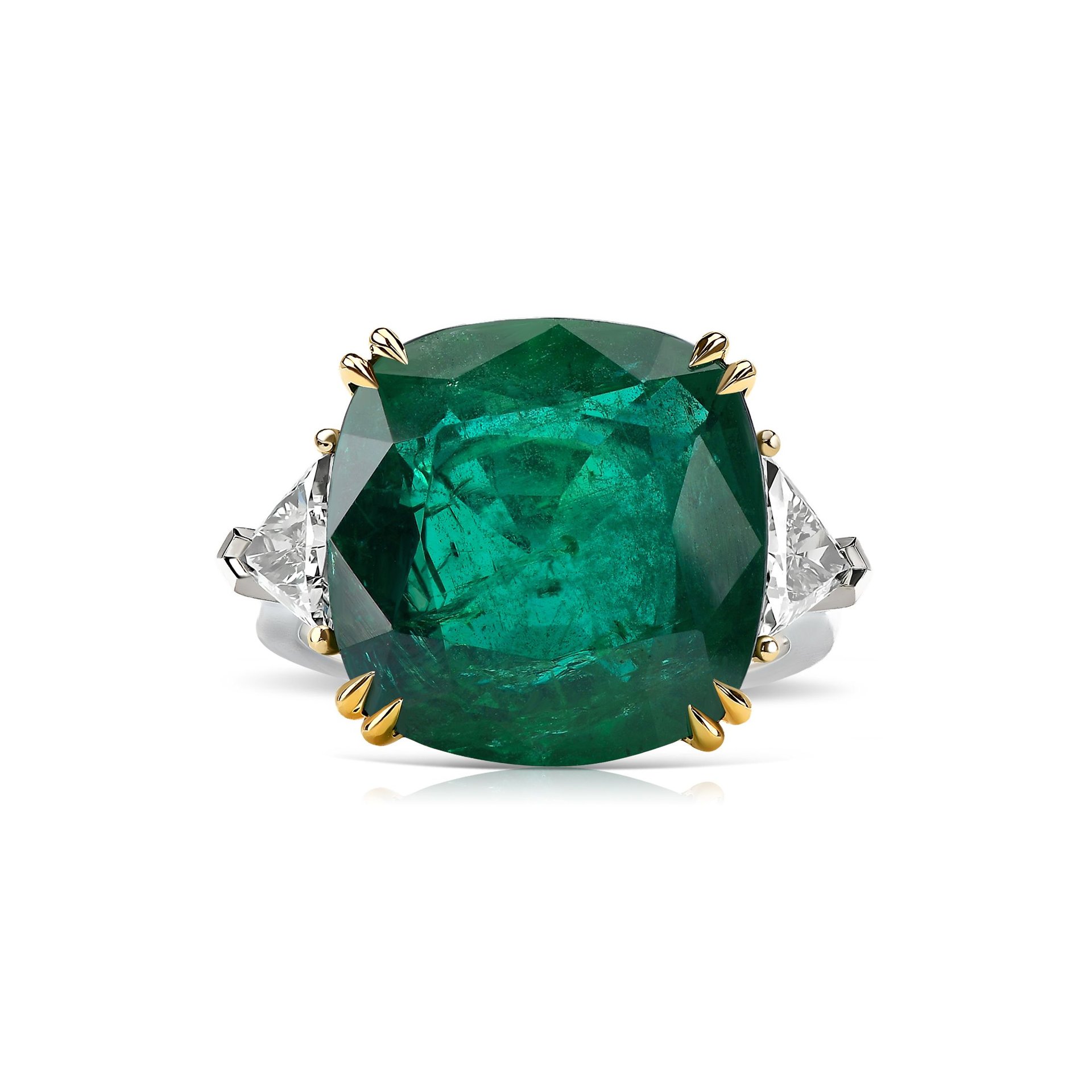 Introducing the 14.66 ct Cushion Emerald Ring from Jewelry Design Studio Parure Atelier. This magnificent piece features a central stone of emerald green, sourced from the lush landscapes of Zambia, its minor inclusions bearing witness to its natural origins and enhancing its intense color. Weighing 14.66 carats, the cushion-cut emerald is a vision of verdant beauty. It is set in 18k white gold, a choice that accentuates the vibrancy of the emerald. Complementing the central gemstone are the trillion cut diamonds on either side, each meticulously chosen to harmonize with the emerald's grandeur, bringing the total diamond weight to 1 ct. This ring is a testament to balance and beauty, where each component is integral, much like a precious puzzle. At Parure Atelier, we are proud to present this ring as a symbol of our commitment to exceptional jewelry making, where every piece is a personal statement of elegance and sophistication.