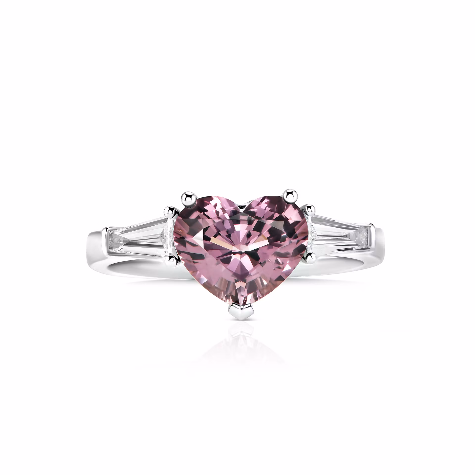 Introducing the heart of romance, encapsulated in Dusty Pink Spinel ring, a design that continues to inspire and enchant. At the center of this enchanting piece is a 1.92 ct heart-shaped spinel. This central stone, embraced by the luster of 18k white gold, is a treasure from Jewelry design studio Parure Atelier, reflecting our devotion to creating not just jewelry, but symbols of love and dedication. The spinel is framed by the sleek elegance of tapered baguette diamonds, totaling 0.265 ct, their geometry offering a striking contrast to the central heart's soft curves. These side stones add a touch of brilliance and sophistication. Heart-shaped stones will never stop to inspire designers. In turn, the precious symbol in the form of a dusty pink spinel set in gold and diamonds is simply irresistible.
