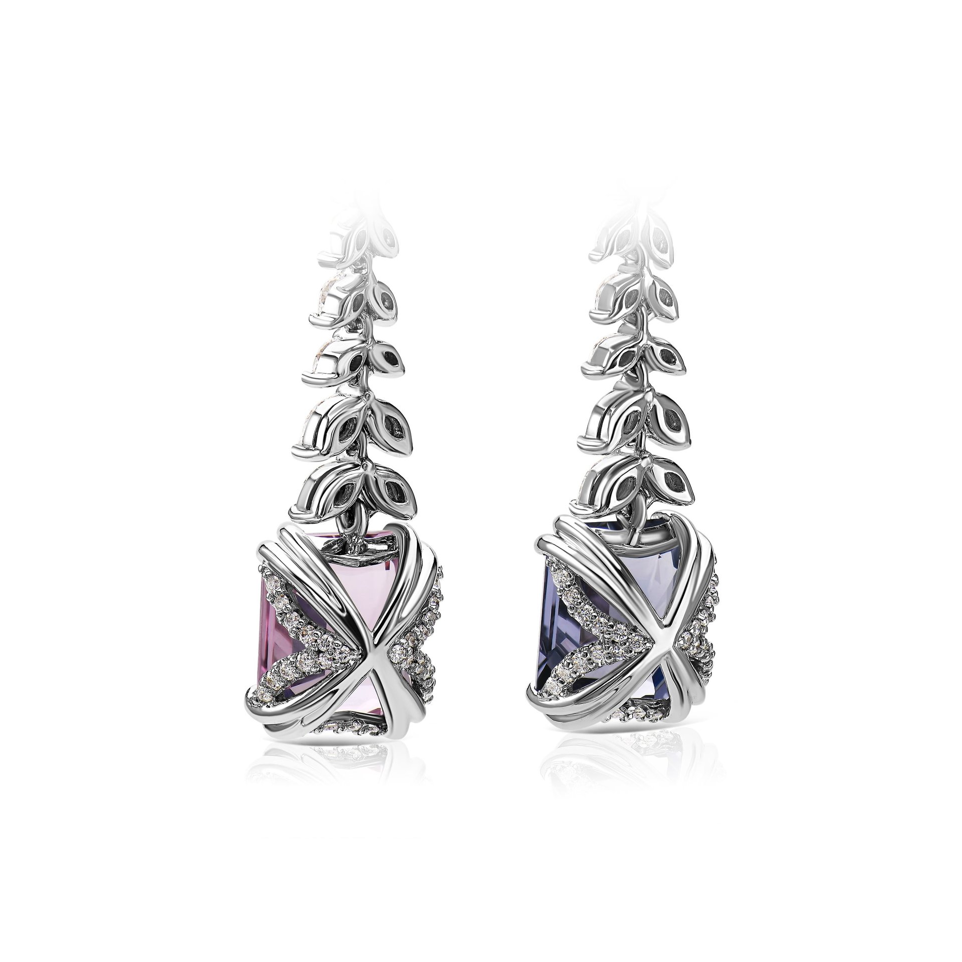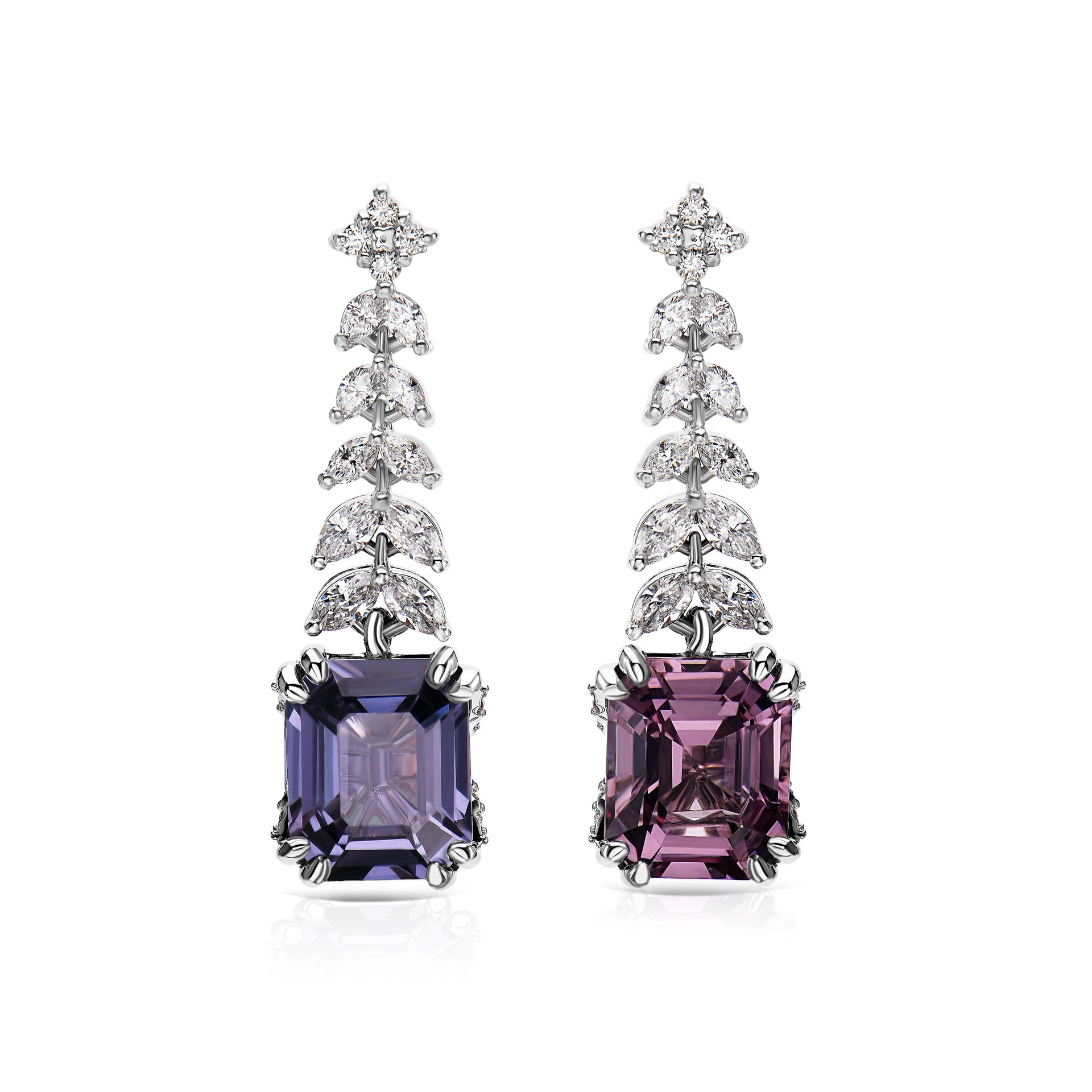 Revel in the unique of Spinel Earrings, boasting central stones of 4.56 and 4.07 carats, crafted by Jewelry Design Studio Parure Atelier. The deep, alluring colors of the octagon-shaped spinels are highlighted by the brilliance of marquise diamonds, totaling 1.193 carats, set in luxurious 18k white gold. The earrings offer a modern twist on classic elegance, where the geometric beauty of the octagon is paired with the vintage-inspired marquise diamond cut. This combination creates a stunning interplay of shapes and lights, reflecting the wearer's sophisticated taste and style. At Parure Atelier, we are dedicated to creating pieces that are not only visually stunning but also resonate with individuality.