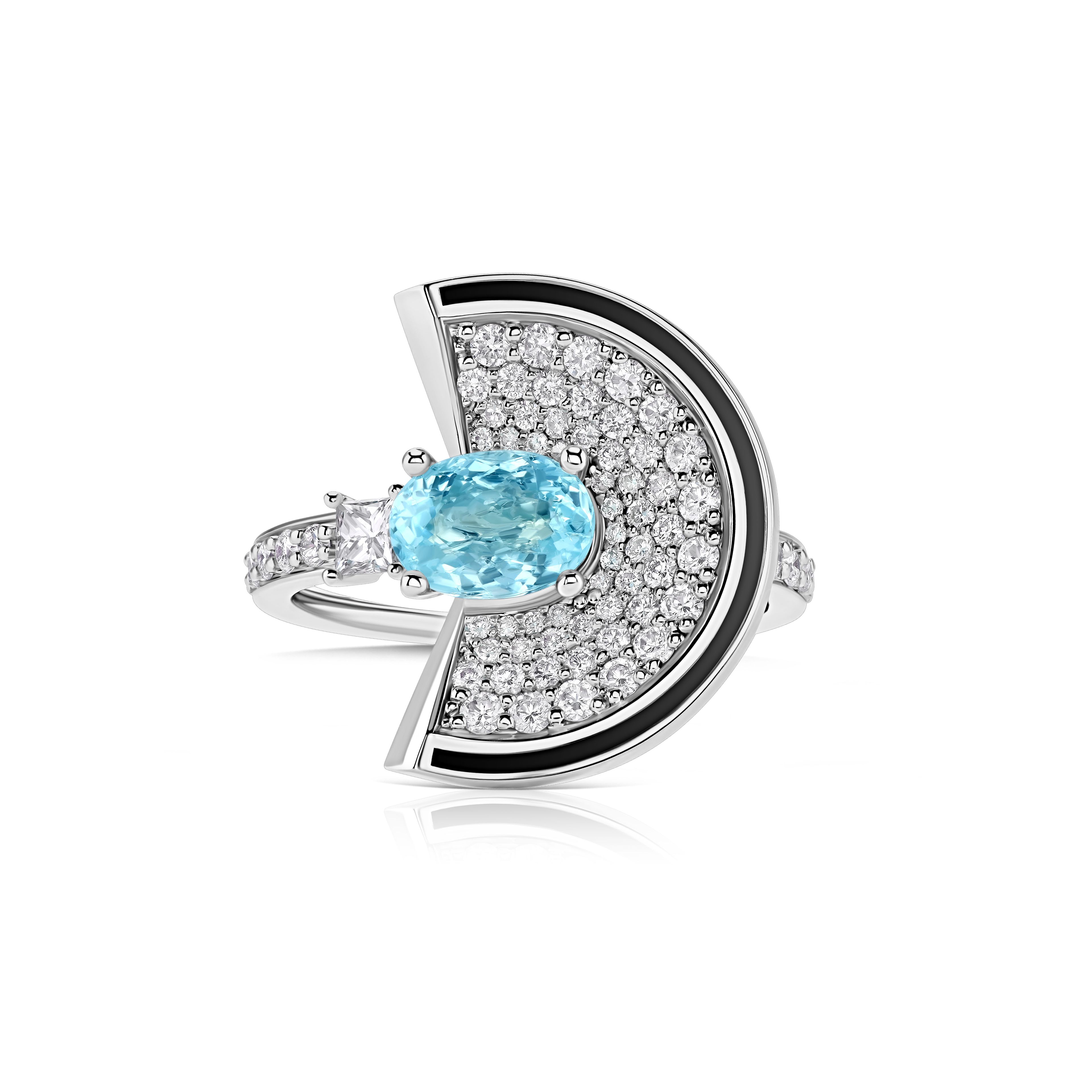 The Paraiba tourmaline ring, a modern masterpiece by Jewelry design studio Parure Atelier, draws inspiration from the Art Deco period. This ring features a stunning 0.98 ct oval Paraiba tourmaline, known for its unique neon blue hue, a treasure of nature's artistry. Nestled within an 18k white gold setting, the central stone is complemented by 0.71 ct of marquise and round cut diamonds, offering a captivating sparkle. Weighing 5.37 grams and sized at 16.5, the ring's design integrates bold shapes, embodying the character of Art Deco celebrated style. This piece is not just an ornament but a tribute to the era of transformation, ideal for those who appreciate the convergence of historical elegance and contemporary craftsmanship.