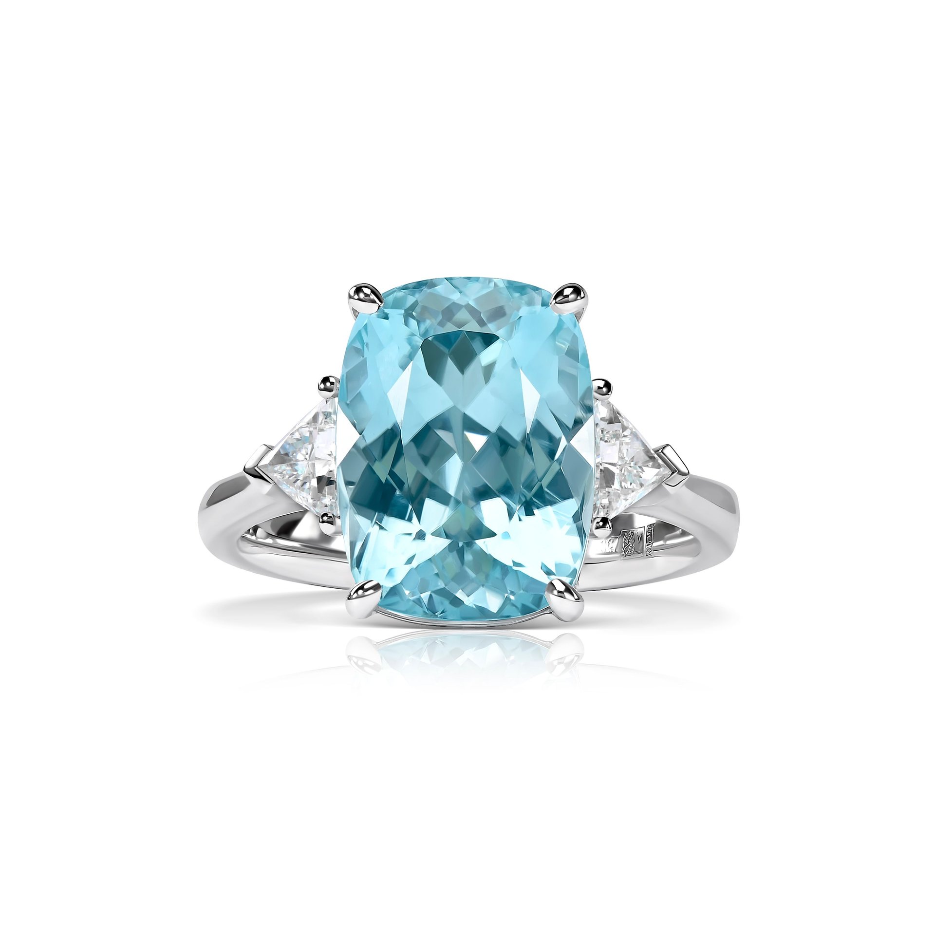 6.14 ct cushion cut Paraiba tourmaline ring, a signature offering from Jewelry Design Studio Parure Atelier. This ring features a mesmerizing Paraiba tourmaline, cherished for its exceptional oceanic hues, cut into a sophisticated cushion shape that maximizes its luster and depth. The 18k white gold setting enhances the stone's vibrant color, providing a stark, beautiful contrast. Adorning the sides, trillion-cut diamonds weighing a total of 0.39 ct serve as luminous companions to the central gem. This piece, available in Dubai, is designed for those with a discerning eye for rare gems set in finely crafted settings.