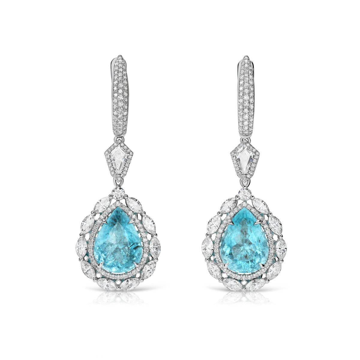 Introducing the Paraiba Tourmaline Earrings 9.35 ct, an extraordinary creation by Jewelry Design Studio Parure Atelier. These earrings feature a pair of 9.35 ct pear-shaped greenish blue Paraiba tourmalines as the central stones, set in 18k white gold. The tourmalines are surrounded by a dazzling array of diamonds. The earrings are adorned with a total of 9.55 ct pear-shaped diamonds and an additional 4.71 ct of round diamonds, enhancing the brilliance and sophistication of the design. In focus: the tourmaline Paraiba, and all around - a real extravaganza of snow-white diamonds.