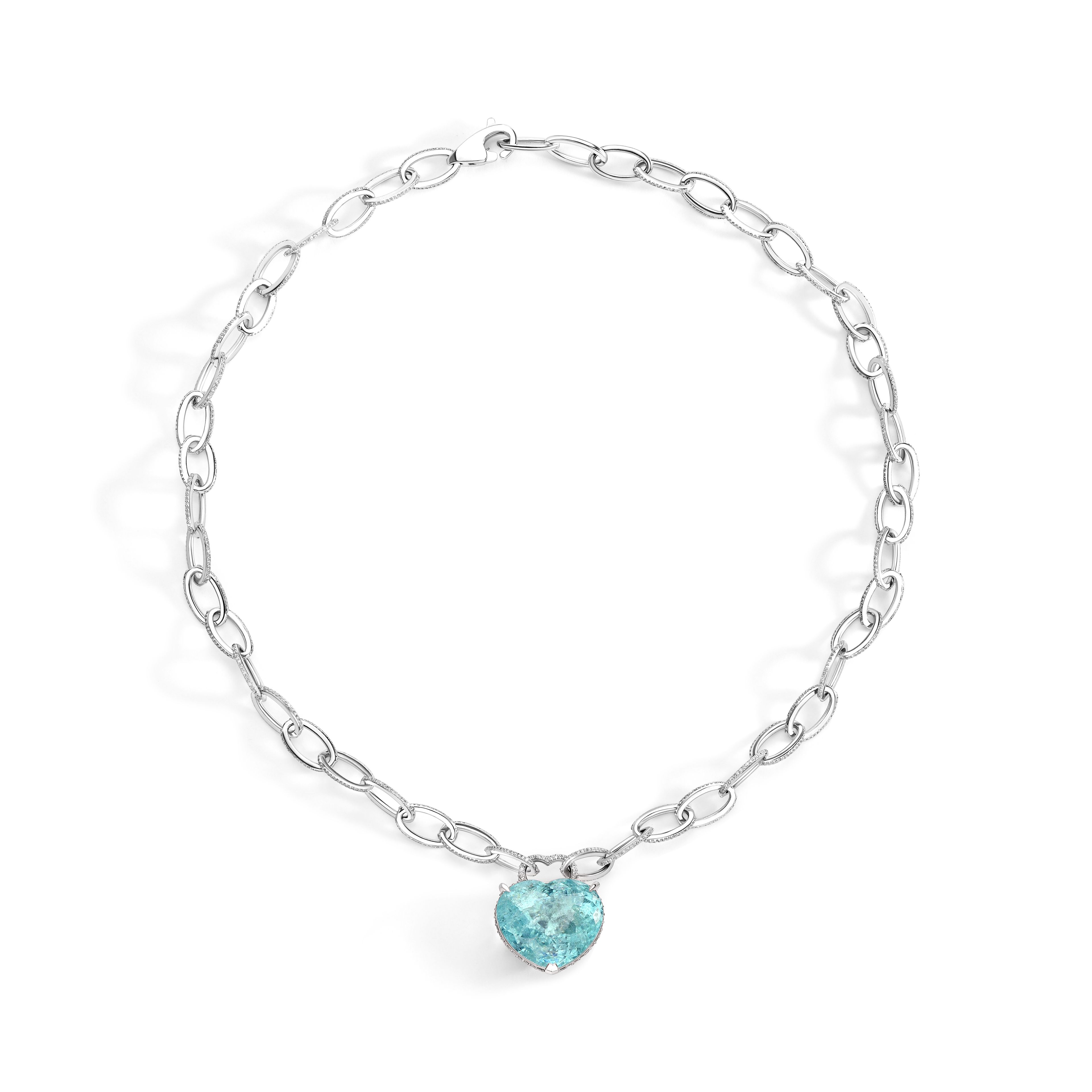 Parure Atelier is delighted to present a jewel: the 27 carat Paraiba Tourmaline Necklace. This piece features a heart-shaped Paraiba tourmaline, celebrated for its vibrant neon blue hue, set in the center of a delicate 750-grade white gold chain. Surrounding this stunning gemstone are brilliant billion-cut diamonds, carefully placed to complement without overpowering the vivid color of the tourmaline. This necklace combines the allure of one of the world's most sought-after gemstones with the timeless elegance of white gold, making it a sophisticated statement piece that's truly in a class of its own.