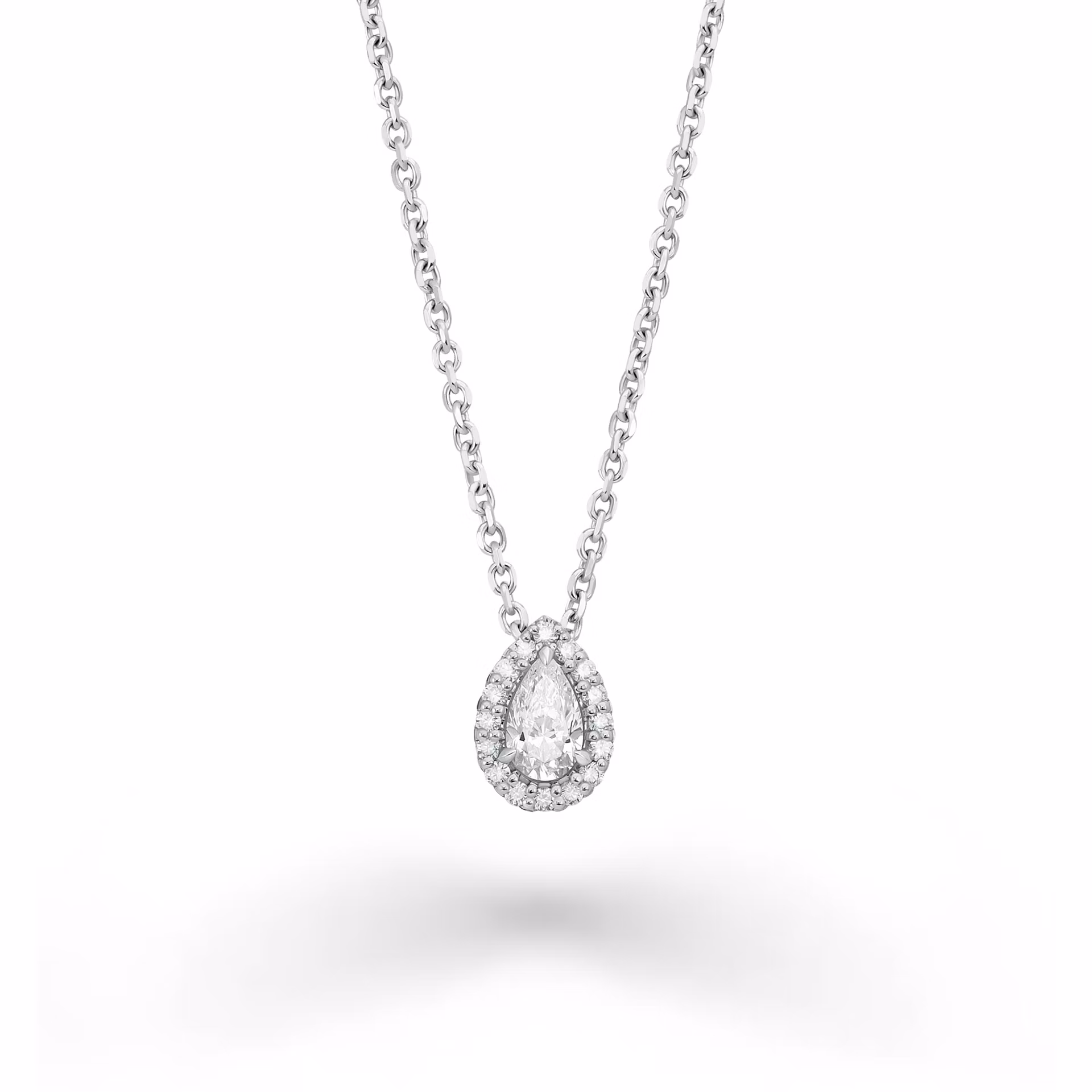 Parure Atelier introduces the epitome of classic beauty: the 0.80 carat Pear Diamond Pendant. This exquisite piece features a central pear-shaped diamond of K/I1 clarity, illuminating with pure and clear brilliance. Complementing the central gem are delicately placed round side diamonds totaling 0.044 carats, each reflecting light in a dance of sparkle. Crafted in 750-grade white gold, the pendant hangs gracefully at a length of 65 cm, epitomizing both elegance and refinement. A classic alliance that combines flowing purest diamonds.