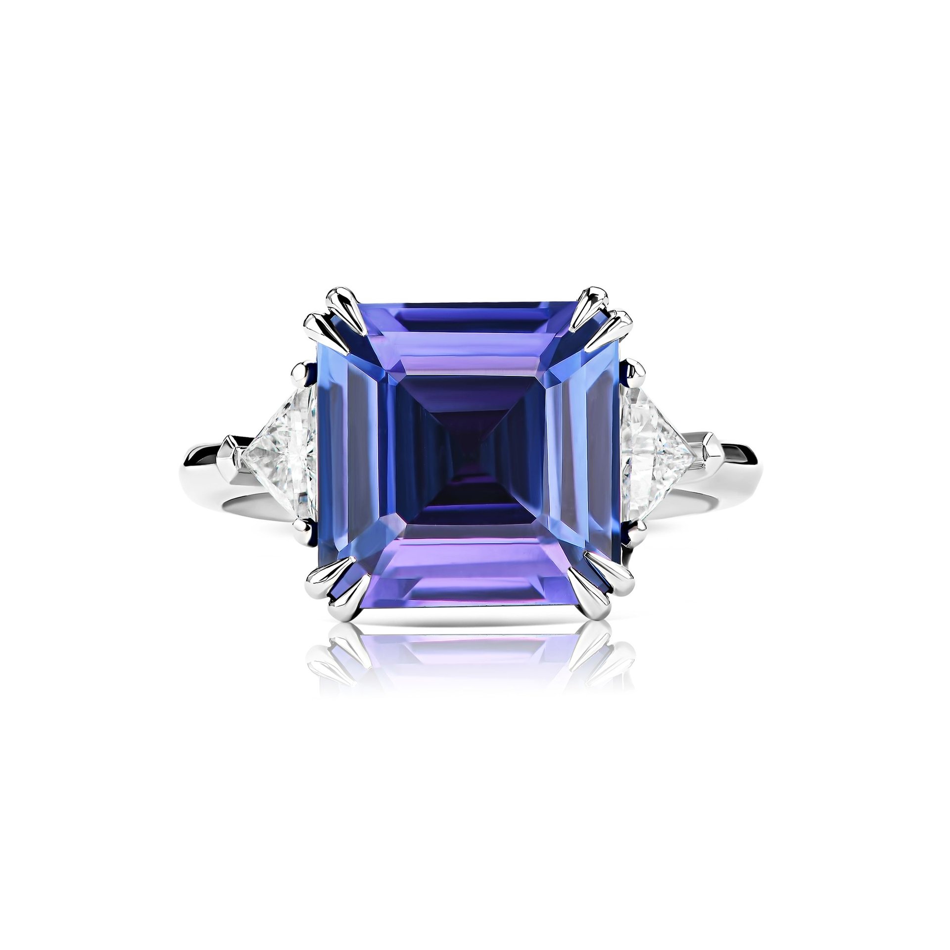 Parure Atelier presents a captivating creation – the Tanzanite Ring, featuring a 7.94 ct bluish-violet tanzanite that exudes a serene oceanic aura. The gemstones octagon shape maximizes its depth and brilliance. Set in 18k white gold, this ring is a harmonious blend of modern design and classic elegance. The tanzanite is flanked by intricately cut trillion diamonds, each chosen for its clarity and sparkle, to accentuate the central stone's majestic hue. The ring's band, also crafted from 18k white gold, is a size 16.5, providing an impeccable fit for its wearer. Its substantial carat weight and bold yet refined aesthetic make it suitable for various occasions, from engagements to celebratory milestones. The Tanzanite Ring by Parure Atelier is a celebration of fine craftsmanship and unique gemstone beauty, making it a perfect addition to any luxury collection.