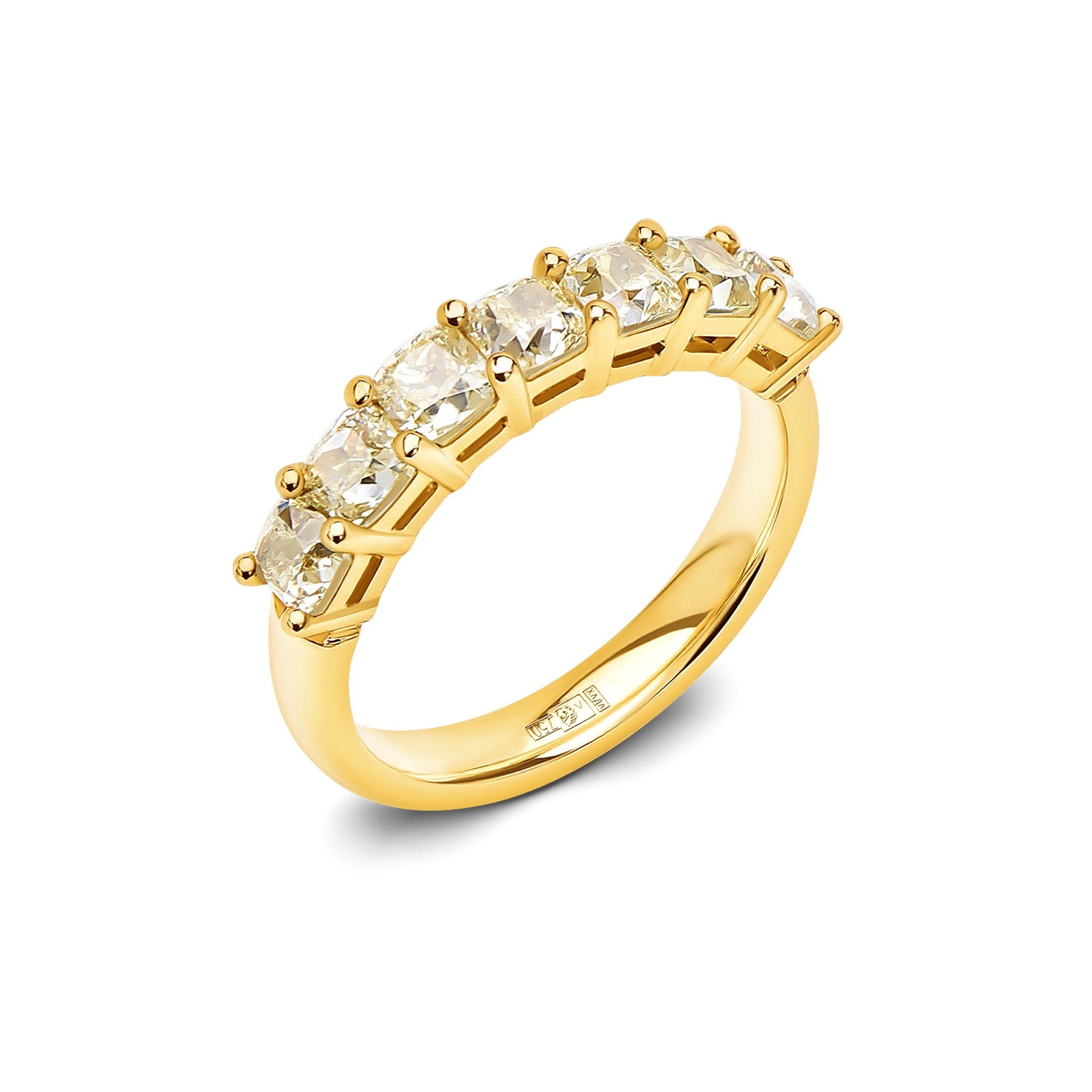 Introducing the Yellow Diamond Band Ring from Jewelry Design Studio Parure Atelier, a piece that exudes a warm radiance. Central to its allure is a 2.582 ct cushion-shaped yellow diamonds, distinguished by its W-X color grade and VS-SI clarity, presenting a symphony of light and luxury. The diamond's sunny hues are rich and vibrant. Encased in an 18k yellow gold setting, this band ring is a meld of classic design and modern allure. Each gold element has been crafted to perfection, providing a secure and elegant backdrop for the yellow diamonds. The ring's band, polished to a high shine, complements the sparkle of the gemstones with its own subtle glow. Weighing 4.50 g and sized at 16.5, the ring is a balanced blend of comfort and statement-making style. It is an offering for the discerning collector in Dubai.