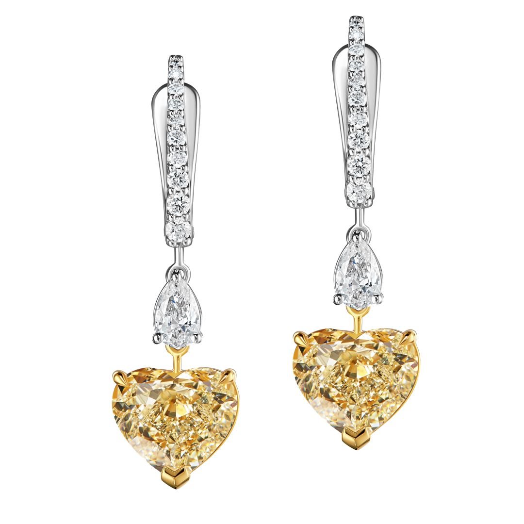 Unveiling the Yellow Diamond Earrings from Jewelry Design Studio Parure Atelier. Central to these earrings are heart-shaped yellow diamonds of 4.25 and 4.41 carats, with W-X and U-V color ratings paired with VVS1-VS1 clarity, presenting a mesmerizing dance of light with every movement. The striking yellow diamonds are cradled in a setting of 18k white gold, symbolizing the blend of warmth and contemporary sophistication. Heart and pear-shaped diamonds serve as side stones, adding a layer of brilliance and intricate detail to the overall design. Each piece at Parure Atelier is a story told through gems and metal, and these earrings narrate a tale of love, passion, and perfection, ready to grace the ears of someone truly special.