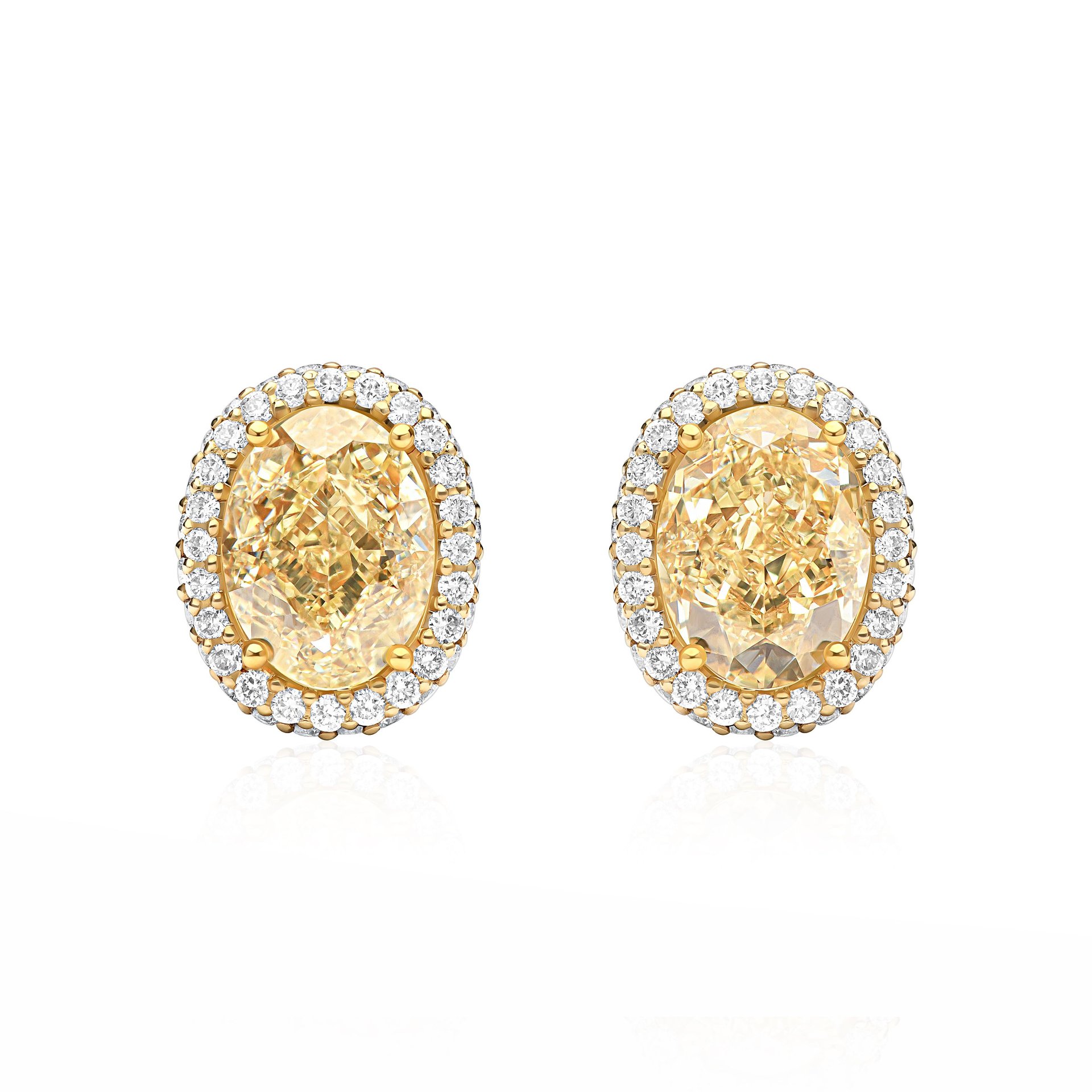 Experience the allure of our Yellow Diamond Stud Earrings, crafted with precision by Jewelry design studio Parure Atelier. These earrings feature a total weight of 6.03 ct, showcasing two stunning oval yellow diamonds at their center, each weighing approximately 3.01 and 3.02 ct. With U-V color and VS1 clarity, these central stones exude a warm, captivating brilliance. Surrounded by delicate round diamonds, these earrings are set in a harmonious blend of white and yellow gold (18k), enhancing the vibrant yellow hue of the central diamonds. Perfect for those who appreciate unique and luxurious jewelry, these yellow diamond stud earrings are designed to make a bold statement.